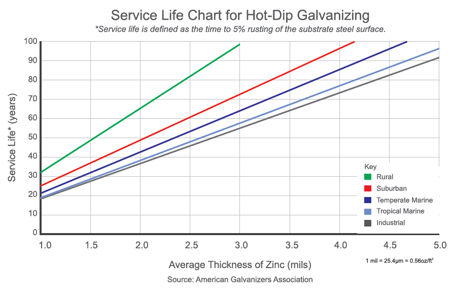 Hot-dip galvanizing (HDG) is a widely used method to protect steel fasteners from corrosion. The HDG coating is low maintenance and offers exceptional corrosion protection for steel structures, lasting 50-70 years in various atmospheric environments, including industrial, urban, marine, and rural settings.